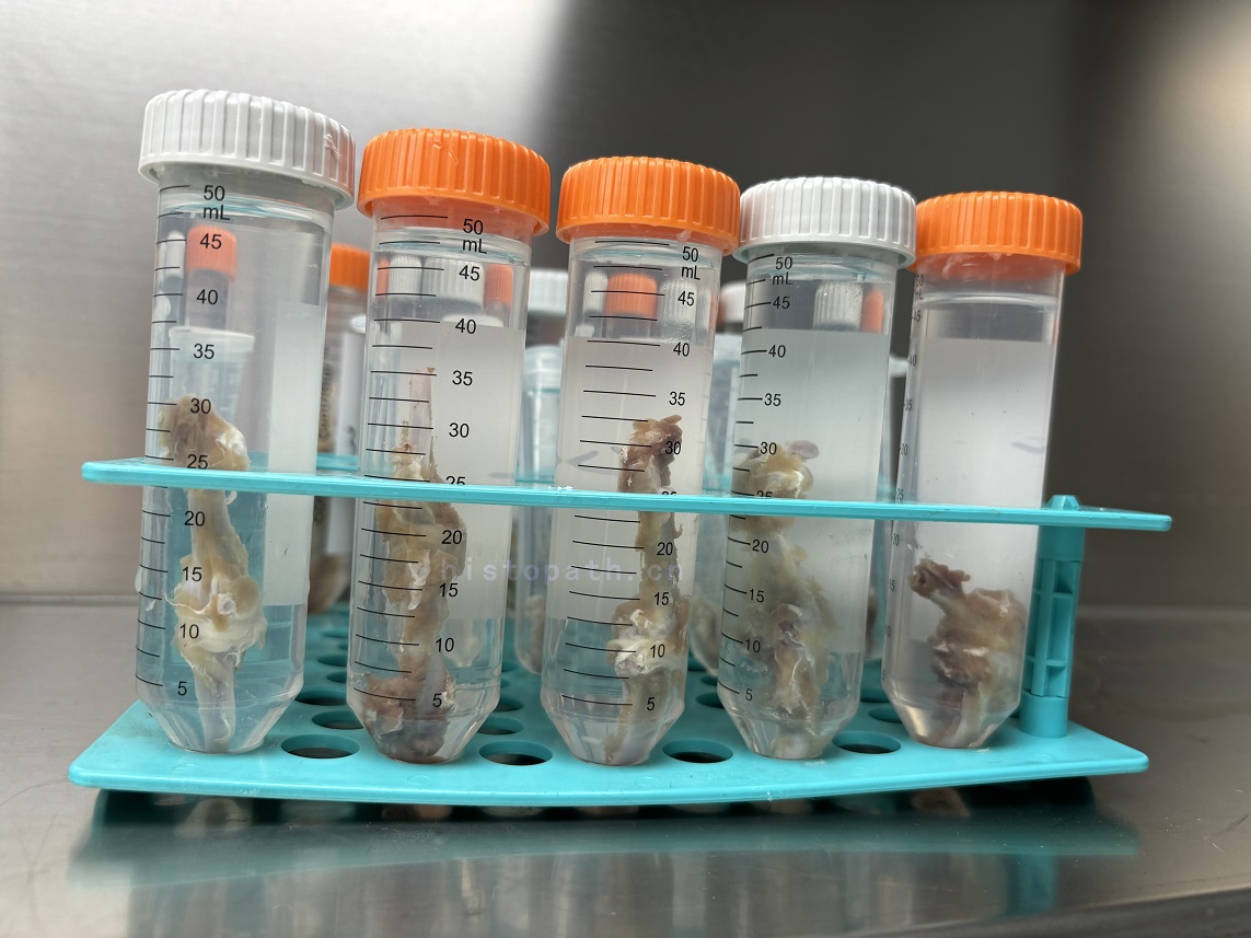 3.脱钙:将组织置于脱钙剂中,每日更换新鲜液、直至组织软化为止。