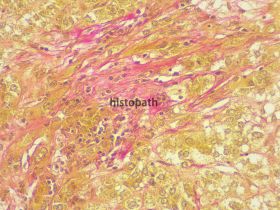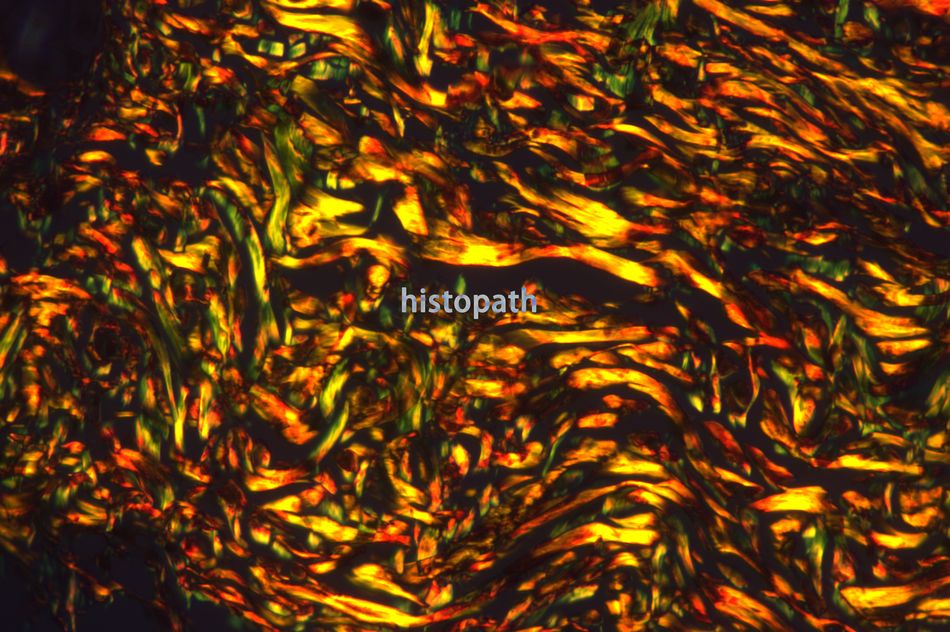 胶原纤维(Collagen Fiber)是结缔组织中分布最广含量最多的一种纤维,广泛分布于各种脏器,其中Ⅰ型胶原纤维主要是骨、皮肤、肌腱;Ⅱ型胶原纤维主要是软骨胶原;Ⅲ型胶原纤维主要在胚胎组织、成人血管、胃肠道;Ⅳ型胶原纤维主要在基膜中。 天狼星红与其衬染液都是强酸性染料,易与胶原分子中的碱性基团结合,吸附牢固。偏振光镜检查,胶原纤维有正的单轴双折射光的属性,与天狼星红复合染色液结合后,可增强双折射,提高分辨率,从而区分两型胶原纤维。