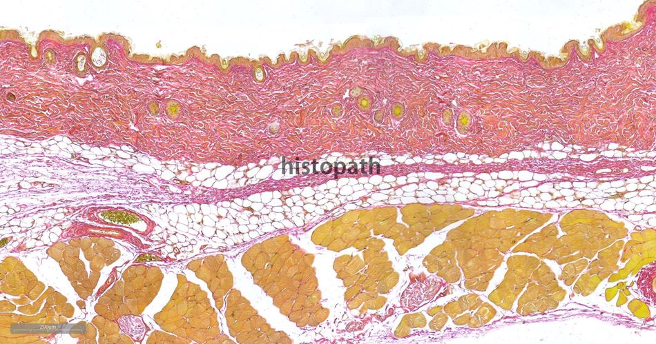 1)光学显微镜观察结果:胶原纤维呈红色,细胞核呈棕褐色到黑色,肌纤维呈黄色。