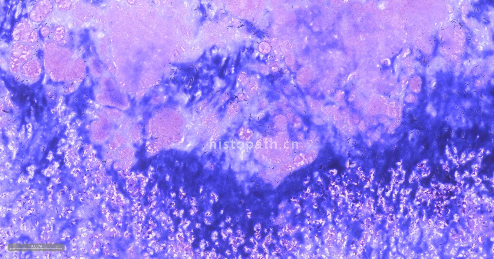 6、 细菌涂片可直接镜检观察。组织切片经60℃烤干后,经无水乙醇快速脱水三次,分别1 s、3 s、5 s。然后经二甲苯透明5 min,最后以中性树胶封片,镜检。