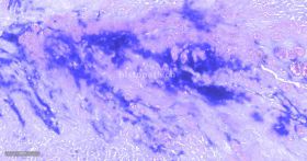4、 脱色:滴加脱色液从载玻片一端冲洗组织进行脱色,直至流下的脱色液不再出现紫色为止,立即水洗去除脱色液。注意控制脱色时间。