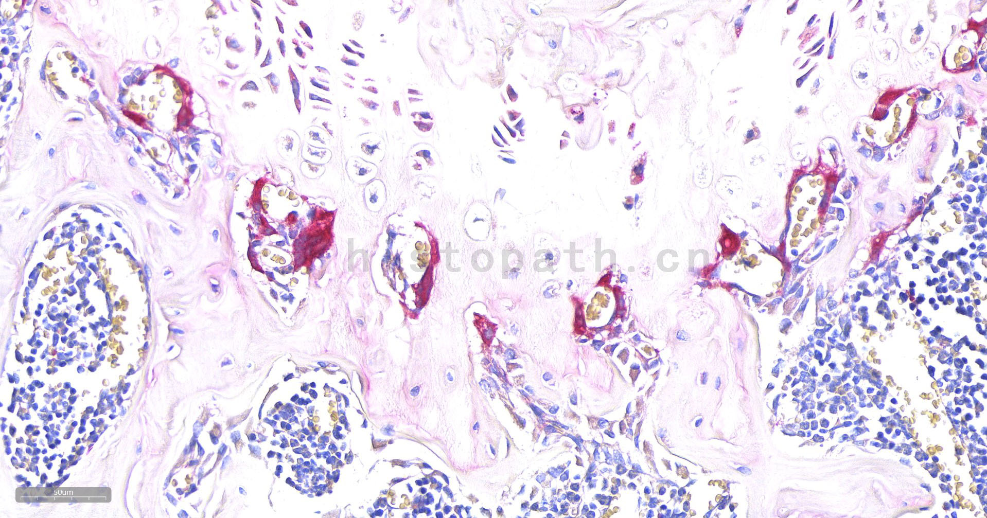 染色结果:破骨细胞呈红色,背景呈绿色或蓝色。