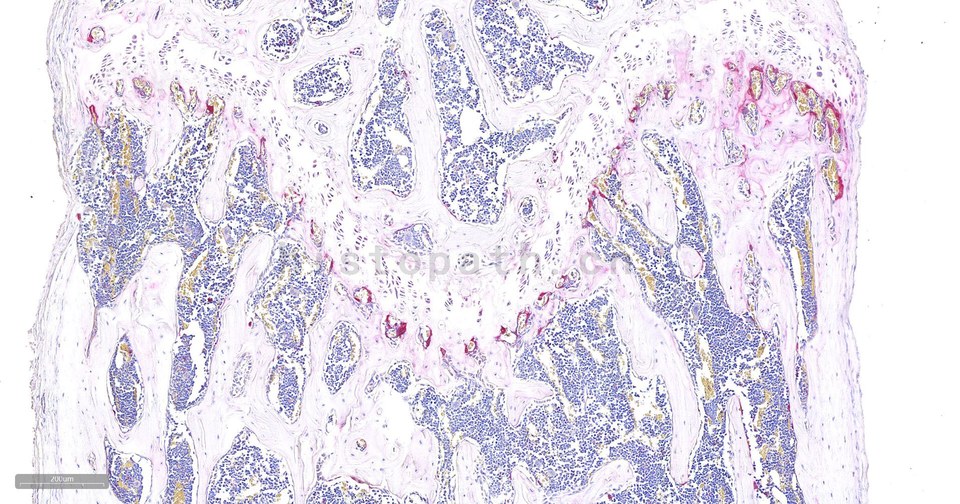 TRAP染色:TRAP 染色是用于检测骨组织、骨细胞中特征物质的染色,使破骨细胞呈红色,背景呈绿色或蓝色。抗酒石酸酸性磷酸酶(TRAP)为破骨细朐的标志酶,特异地分布于破骨细胞中,为破骨细胞所特有,通常作为鉴别破骨细胞的重要标志物。在含酒石酸的酸性条件下,TRAP 能将萘酚 AS-BI磷酸盐水解,产生的萘酚 AS-BI 立即与 fast red 或六偶氮副品红结合,在酶活性部位形成不溶性的红色染料,通过观察红色染料的形成可间接了解酸性磷酸酶的活性,进一步鉴别及分析破骨细胞的状态。