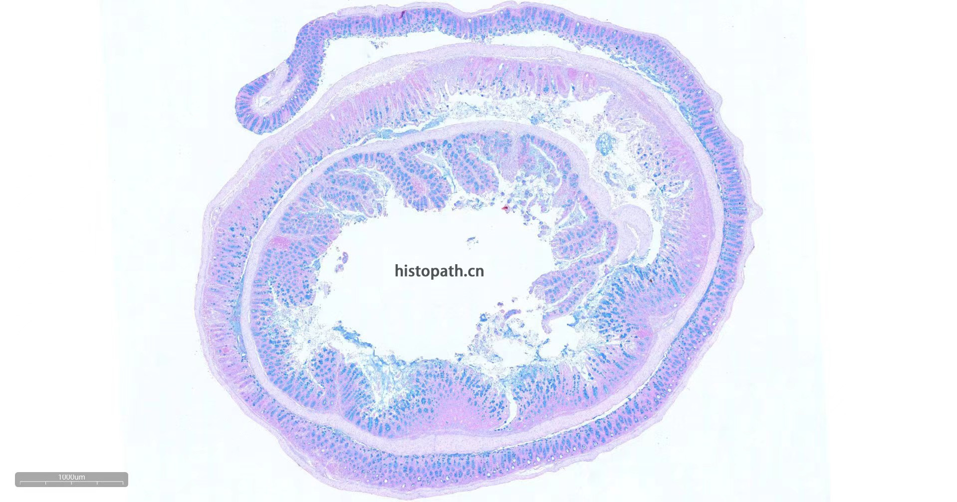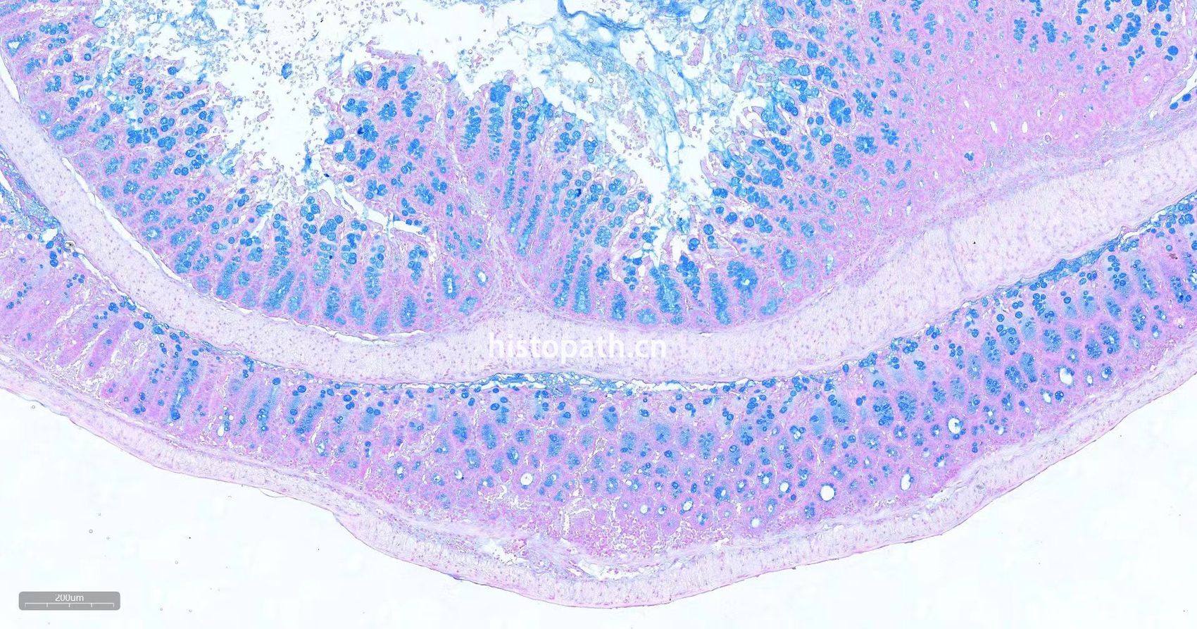阿利新蓝(Alcian)又称爱先蓝或阿尔辛蓝等,是一种类铜钛花青共轭染料,这种阳离子染料与酸性基团结合,即阿尔辛蓝与组织内含有的阴离子基团如羧基和硫酸根形成不溶性复合物。阿利新蓝由中央含铜的酞菁环与四个异硫脲基通过硫醚键相连而成。该异硫脲基呈中度碱性,使阿利新蓝带阳离子。利用染液的不同pH值可区分粘液物质的类属,pH 值为2.5时组织内的羧基电离,带有一个负电荷,与阿利新蓝中的阳离子形成盐键,是带有羧基的组织(如蛋白多糖/透明质酸以及上皮酸性黏蛋白)染色。pH值为1.0时,组织内的硫酸根电离,带有一个负电荷,与阿利新蓝中的阳离子形成盐键,使带有硫酸根的组织(如硫酸黏液物质)染色。中性黏蛋白(如胃黏膜和Brunner腺体部位的中性黏蛋白)不能与阿利新蓝反应。