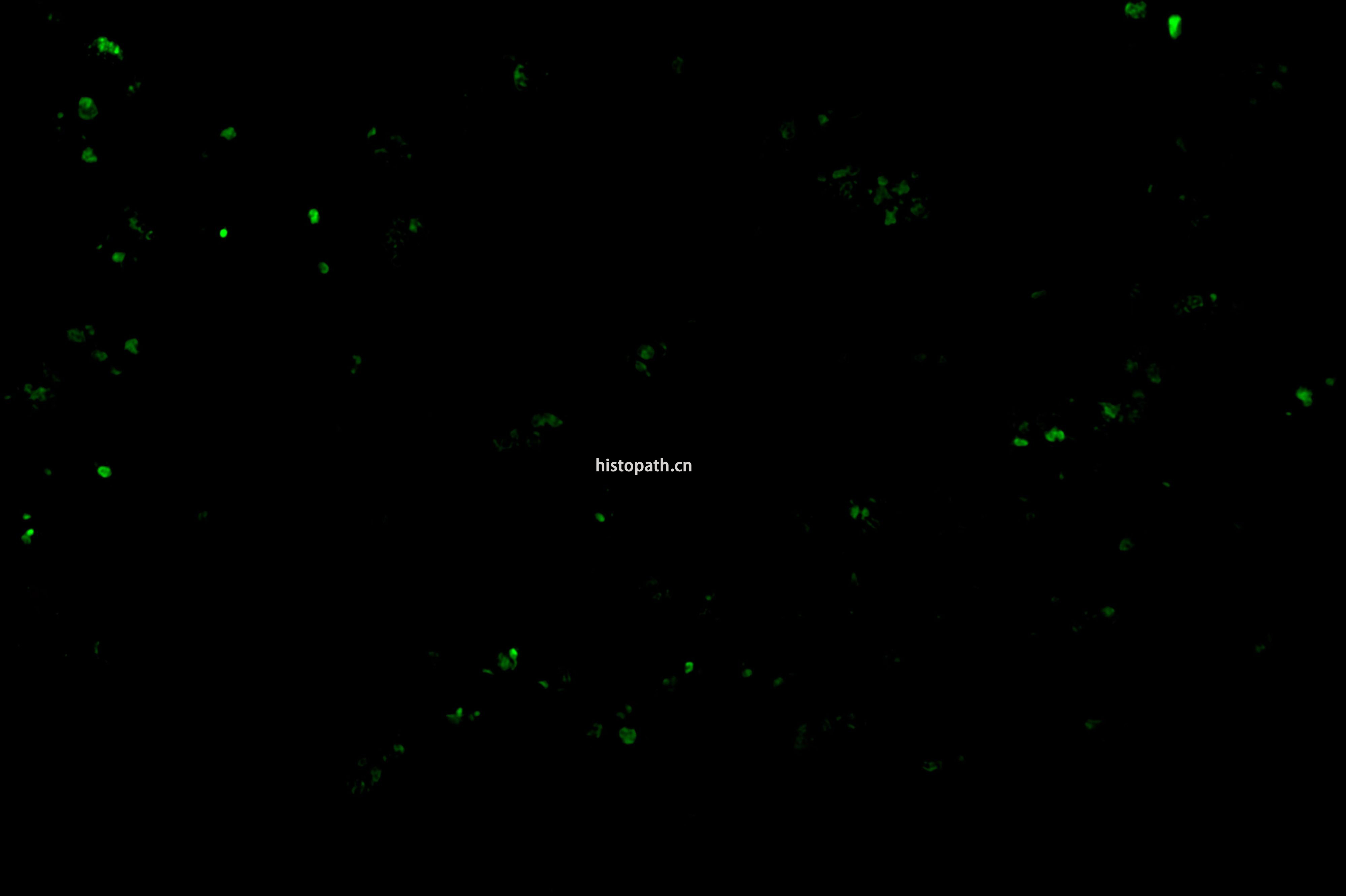 细胞在发生凋亡时,会激活一些DNA内切酶,这些内切酶会切断核小体间的基因组DNA。细胞凋亡时抽提DNA进行电泳检测,可以发现180-200bp的DNA ladder。基因组DN A断裂时,暴露的3'-OH可以在末端脱氧核苷酸转移酶(Terminal Deoxynucleotidyl TransferaseTT)的催化下加上绿色荧光探针荧光素(FITC)标记的dUTP(fluorescein-dUTP),从而可以通过荧光显微镜或流式细胞仪进行检测,这就是TUNEL(T dT-mediated dUTP Nick-End Labeling)法检测细胞凋亡的原理。