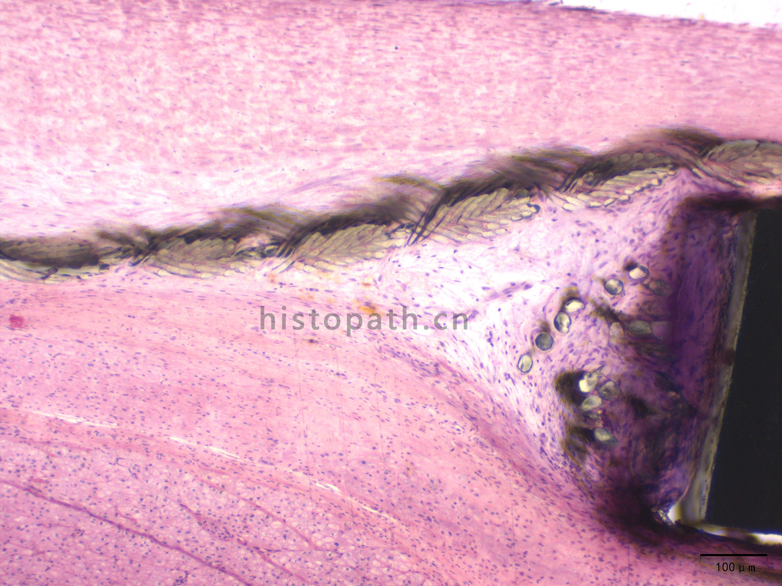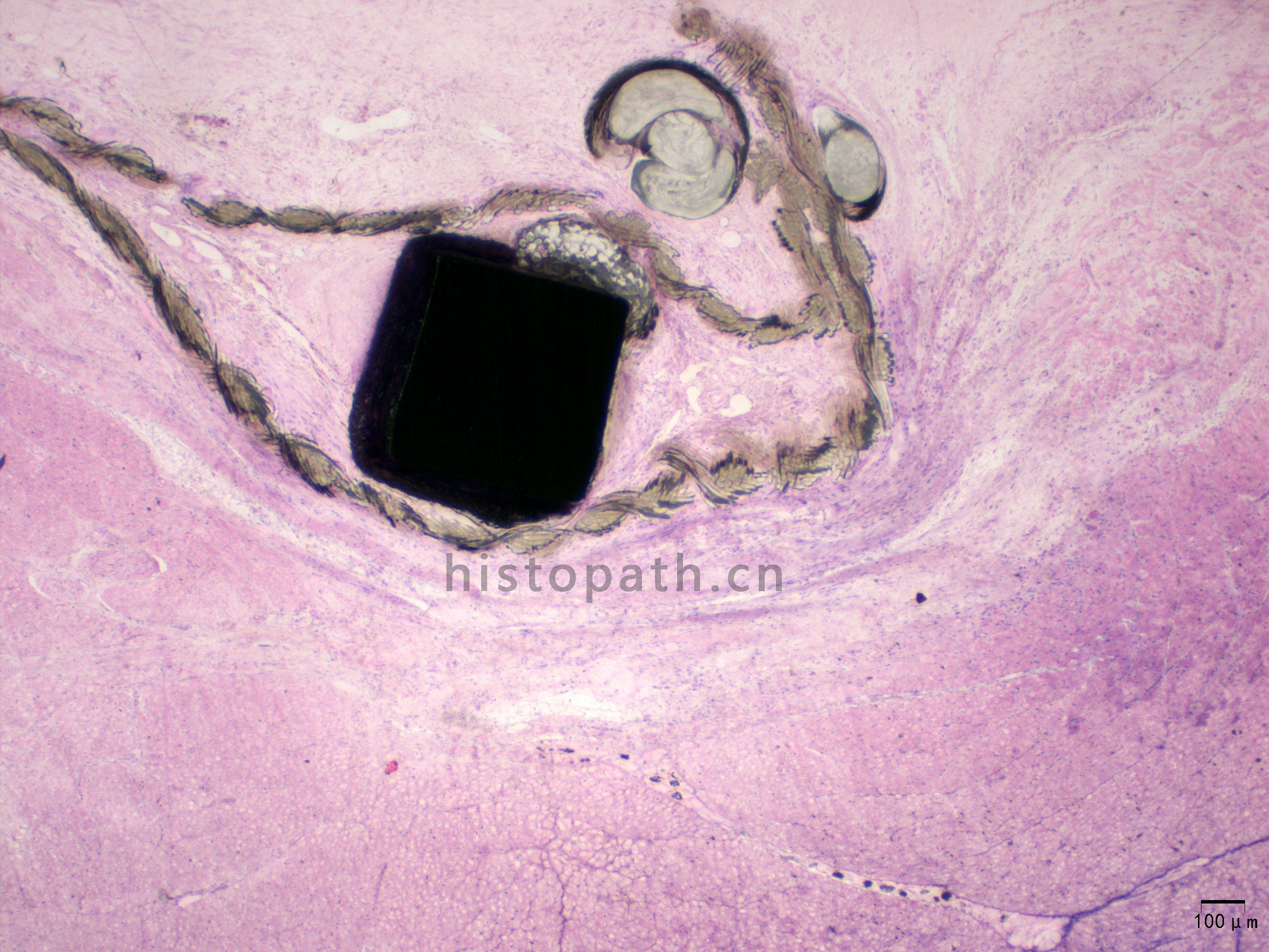 将包埋好的硬组织树脂块,用EXAKT 硬组织切片机先切一个200um的厚片,然后再通过EXAKT 硬组织磨片机将其磨到20-30um薄片,样本是已经硬组织包埋好的含金属的动物样本。